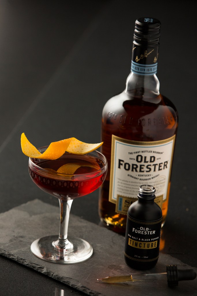 - Ingredients: 1 dropper of the Salt & Pepper Tincture combined with 1.5 oz Old Forester 86 Proof, 1 oz Sweet Vermouth and 1 oz Campari