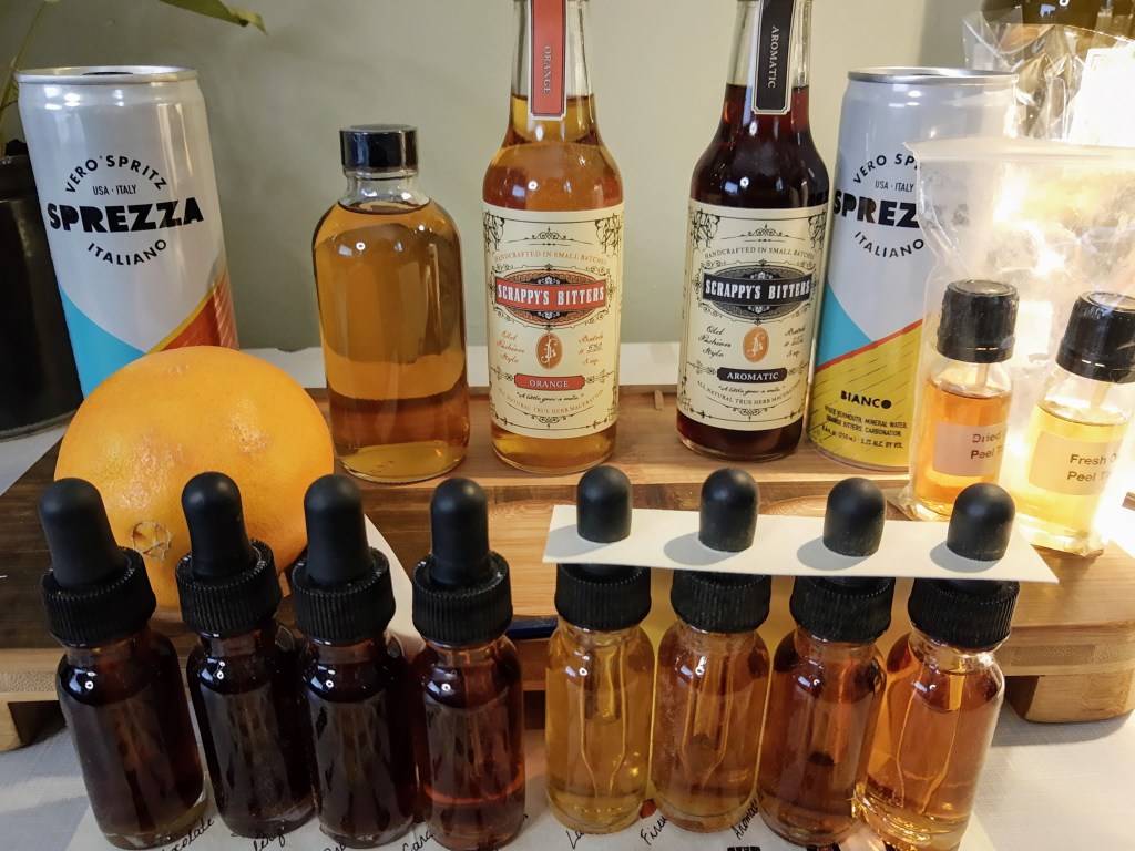We started with a set of eight different unlabeled Scrappy’s Bitters and a mix of whiskey and simple syrup. Once we put some ice and the whiskey mixture in a glass we were invited to pick a few different bitters and put in there. The idea is that we don’t want to limit ourselves when it comes to the flavors that can go into an Old Fashioned.