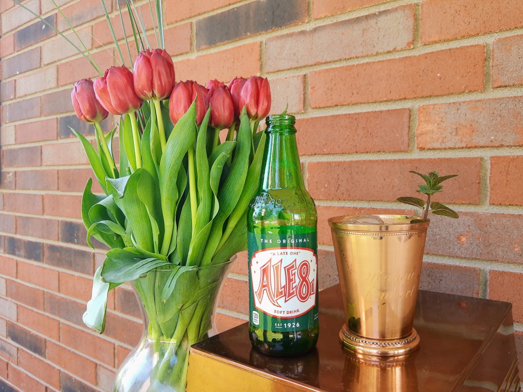 Muddle mint and bourbon. Add crushed ice (Sonic sells bags of pebble ice!). Top with Ale-8.