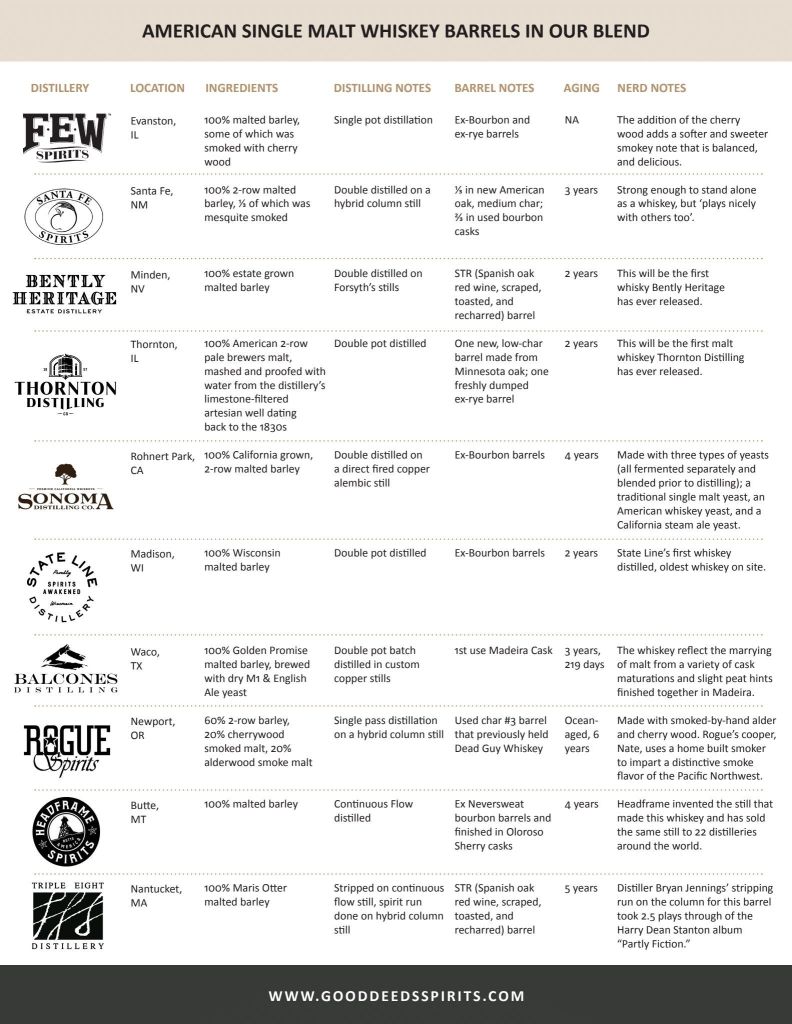 Paul Hletko reports that FEW Spirits donated 100% of their distillery’s year’s allocation of American Single Malt whiskey to this project, some of which was smoked and some not. Rogue Spirits donated Cherrywood and Alderwood smoked single malt, says Jake Holshue. John Mleziva from State Line Distillery donated the first whiskey his distillery ever made, featuring Belgian yeasts and aged in a former FEW Bourbon cask. Santa Fe Spirits donated a mesquite smoked single malt, adding additional complexity to the blend.
