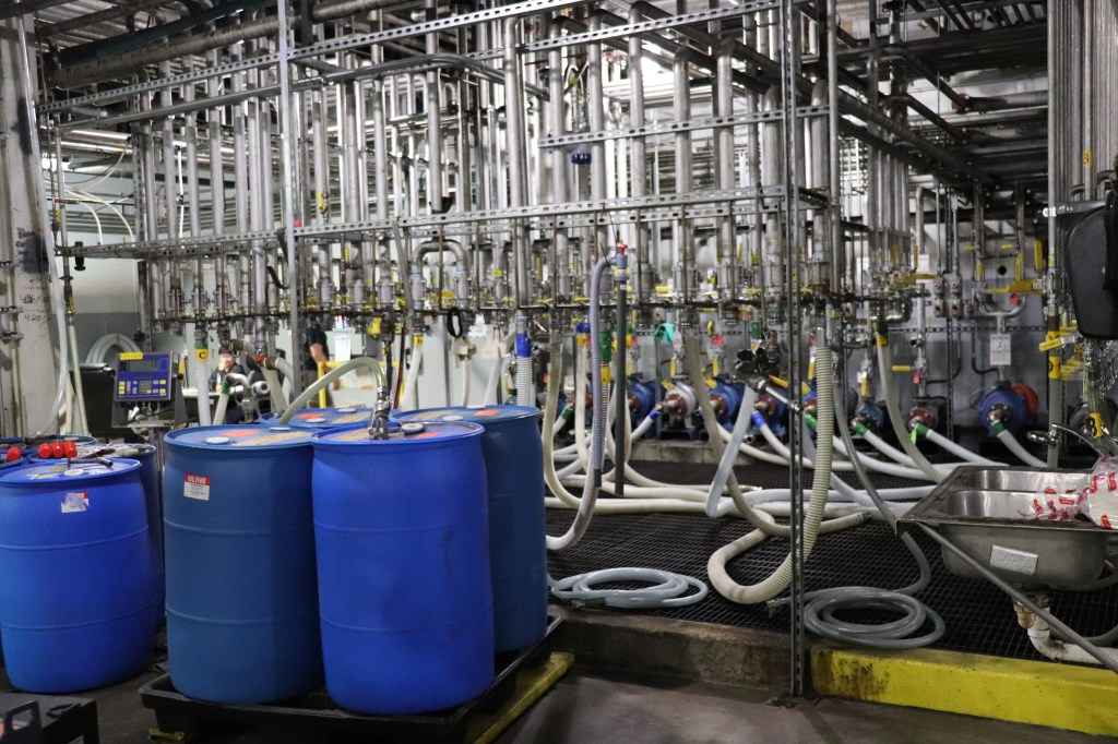 Something else you rarely see that also boggles my mind at this scale. This is where the pumps feed single barrels to the barreling line. Think about the scale of single barrels that would necessitate this many pumps.