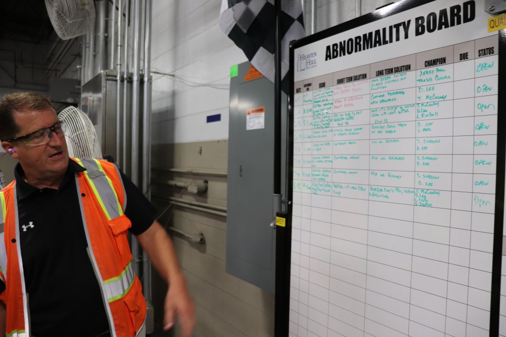 I was incredibly impressed by this. It’s a newer system to address production hiccups. During meetings workers from all areas of the plant will bring up any issues they have noticed. The team will brainstorm and come up with a potential solution. It goes on the board and is assigned to whichever person is in the best position to address it. It’s very collaborative, which I think is unusual for such a large company.